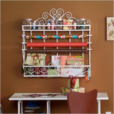 CSN0626 Size: Small This wall mount craft storage rack is the perfect solution for organizing your buckets of ribbons and bows. With a shelf on top and on bottom to store jars and spools, a rack to stock ribbon rolls, hooks to hang extra present tags on your organization problems are over! The storage is not only handy but beautiful as well, with a beautiful white scroll work design. Add one to your craft room today! Features: -Storage rack. -Antique white finish. -Available in small or large size. -Metal tube construction. -Beautiful scroll work design. -Two storage shelves. -Three movable racks to hold a standard size wrapping paper. -Easy as hanging a picture. -Assembly required. -Manufacturer provides one year warranty on parts. -Large storage rack dimensions: 34'' H x 34.75'' W x 7.25'' D.